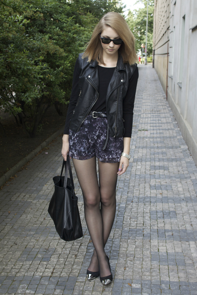 Ty nejkrásnější šortky, které jsem dostala od Elišky k narozeninám. Jsou volnější, lehce průsvitné a s potiskem kočičích hlav. V pase mají gumu, takže jsou neuvěřitelně pohodlné. K nim jsem si vzala černé basic tričko a přes něj koženkovou vestu. Lodičky jsou momentálně moje nejoblíbenější, přijde mi, že vypadají skvěle úplně ke všemu. Kromě toho jsem dneska konečně našla ty pravé šaty na státnice, obchody, kde běžně nakupuji v tomhle směru zklamaly, naopak Pietro Filipi mě mile překvapilo, našla jsem tam přesně takové, jaké jsem si představovala. Brzy vám je ukážu :).