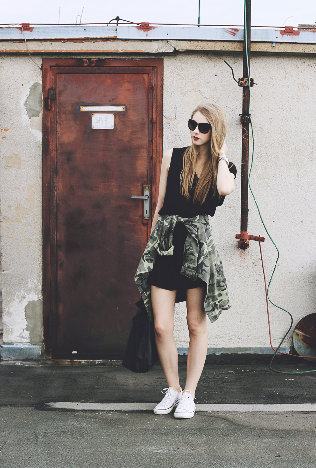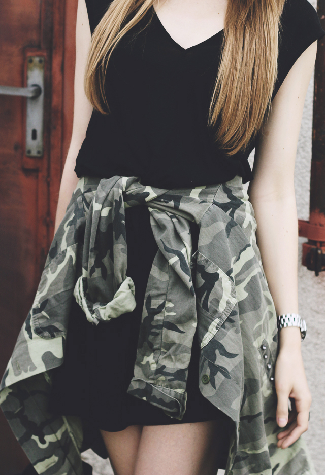 Maskáčový vzor sice není tuhle sezónu top trendem, ale tuhle košili naprosto zbožňuju už od té doby, co jsem si jí pořídila. Přes den bylo horko a měla jsem jí uvázanou takhle kolem pasu, ale na večer už začal foukat vítr a bylo chladněji, takže jsem si jí vzala přes šaty. K outfitu jsem obula bílé Conversky a dala si jasně červenou rtěnku od Rimmel Kate Moss, odstín 111, kterou teď nosím asi nejčastěji. Po dlouhé době jsem si také vyžehlila vlasy a udělala si pěšinku uprostřed. Co na tenhle účes říkáte?